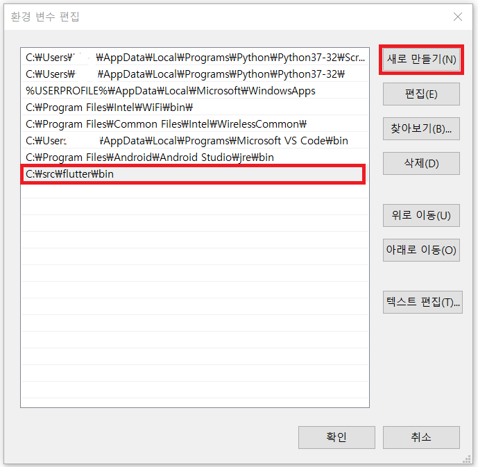 윈도우10의 cmd 또는 Android Studio 콘솔에서 Flutter 명령을 사용하기 위해 환경 변수로 등록한다