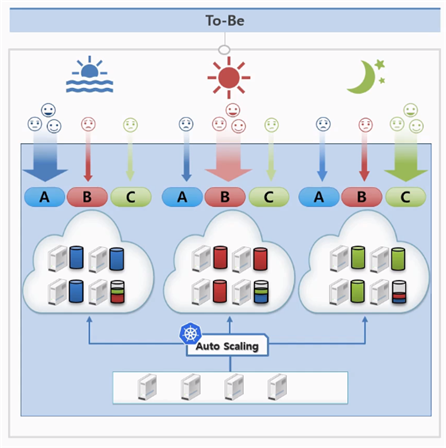 같은 시간에 4대의 서버 자원이면 충분하기 때문에Auto Scaling 기능을 적용해 각 시간대 별 트래픽에 따른 서비스 자원 할당이 가능함