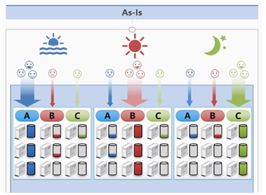 각각 아침 점심 저녁에 접속 트래픽이 많아 모두 정상적인 서비스를 제공하기 위해 어쩔 수 없이 3대의 서버를 할당해야 함