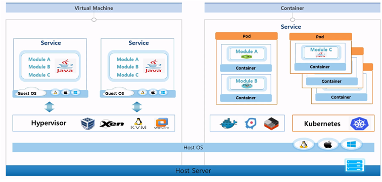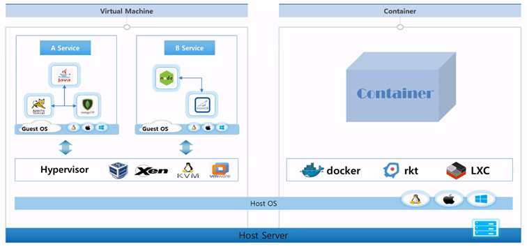 시스템 구조에서 오는 차이점?- 공통적으로 하나의 서버가 있음 한 서버에는 기본적으로 어떤 운영체제가 됐건 Host OS가 올라감 - VM의 경우 이 Host OS위에 VM을 가상화 시켜주기 위해 여러 Hypervisor가 있음 이런 것들을 사용해서 원하는 운영체제로 Guest OS를 올려 여러 VM을 만들 수 있음