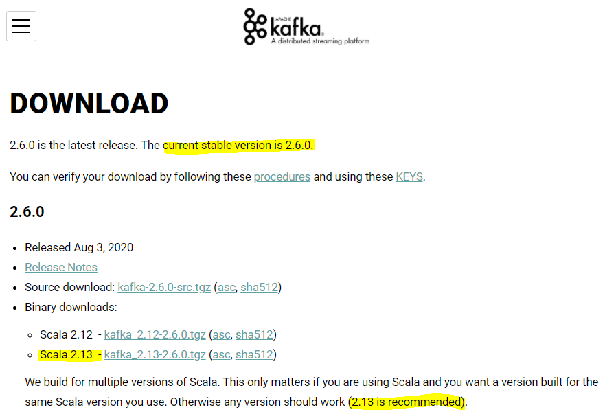 설명을 읽어보면 내가 현재 Scala를 사용할 경우 Kafka와 Scala 버전을 일치시키려면 해당 버전을 다운로드 받으면 된다고 한다.