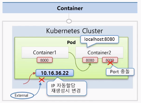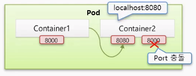 한 컨테이너가 포트를 하나 이상 가질 수 있지만 한 파트에서 컨테이너들끼리 Port가 중복될 수 없다!