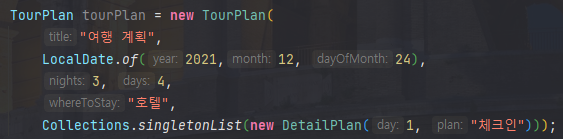 new TourPlan("여행 계획", LocalDate.of(2021,12, 24), 3, 4, "호텔",