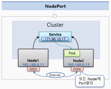 외부로부터 어느 Node던 간에 그 IP의 포트로 접속을 하면 해당 Service에 연결이 된다!