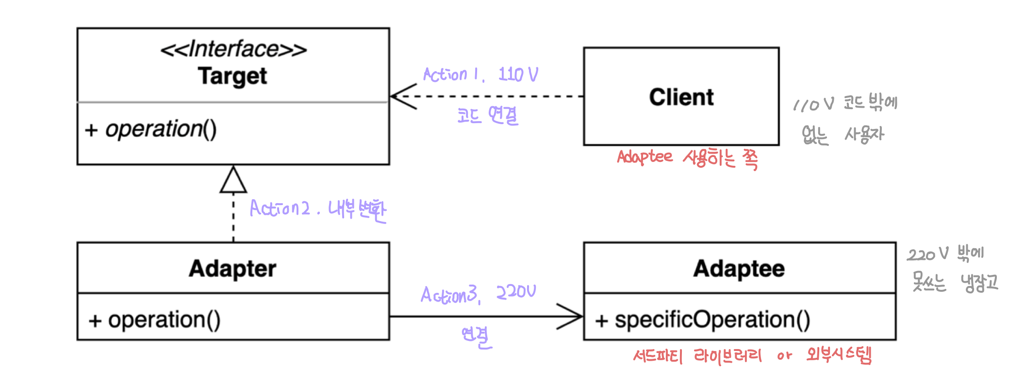 - Adaptee에 해당하는 클래스(ex. 한국에서 미국으로 들고온 한국 냉장고)