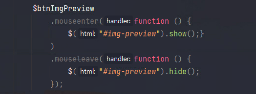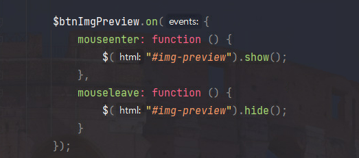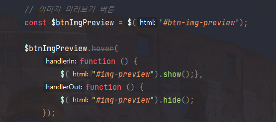 이미지 미리보기 버튼에 마우스를 올리면 미리보기 이미지를 띄우고, 마우스가 벗어나면 사라지는 요구사항이 있다.