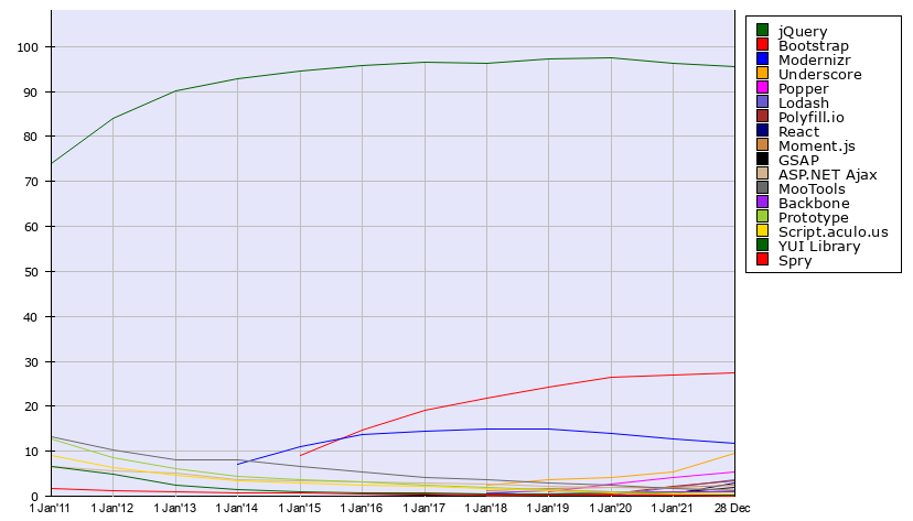 jQuery에 대한 전세계적인 관심이 떨어지고 있지만, W3Techs Survey에 따르면 javascript 라이브러리 사용 동향에 jQuery의 비중은 이상하리만큼 높다.