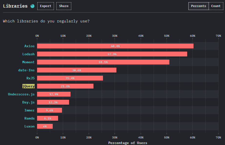 2020 - stateofjs.com 가 공개한 Survey에 따르면, Axios가 60%이상인데 반해, jQuery는 20%까지 떨어진 통계를 확인할 수 있다.