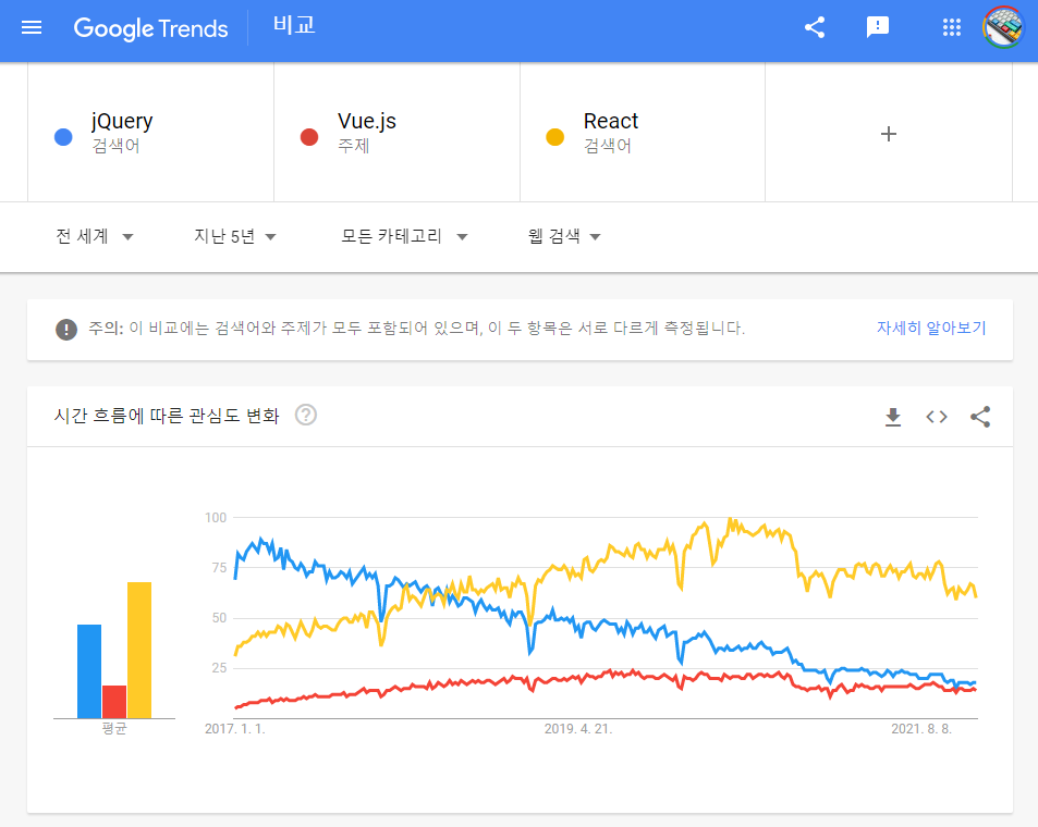 가상 돔을 사용하는 라이브러리인 React와 Vue.js가 등장하고, 웹 표준 API의 확장으로 jQuery에서 제공하던 편의 기능을 브라우저 레벨에서 제공할 수 있게 되는 등 여러가지 요인에 의해 jQuery는 개발자들 사이에서 입지가 떨어지고 있는 것으로 보인다.