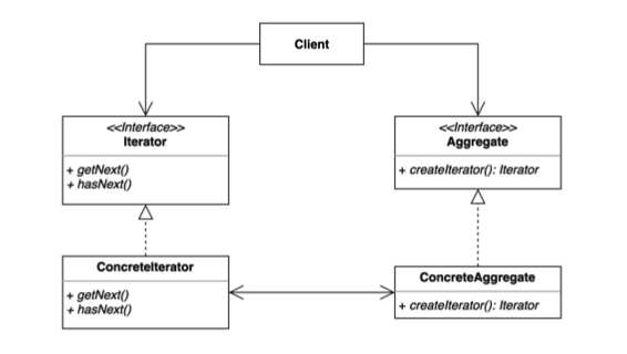 Iterator 인터페이스는 자바에서 제공하고 있으므로 구현체(ConcreteIterator)만 생성하면 된다.