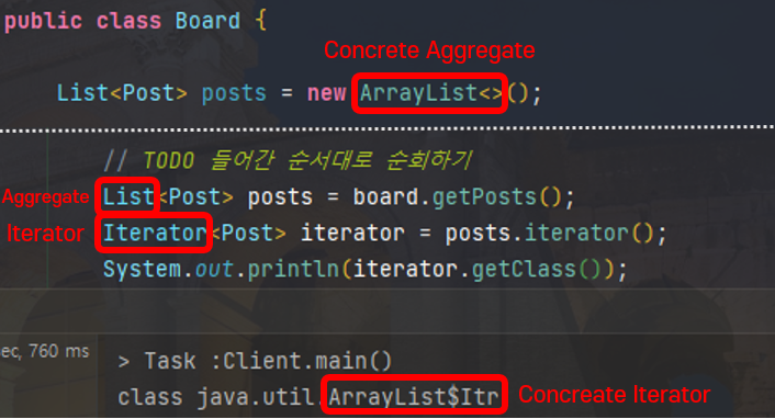 posts의 실제 구현체인 ArrayList가 ConcreteAggregate, 그리고 Iterator에 실질적으로 넘어올 수 있는 여러 타입들이 ConcreteIterator가 된다.