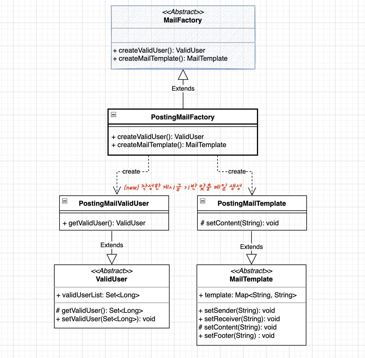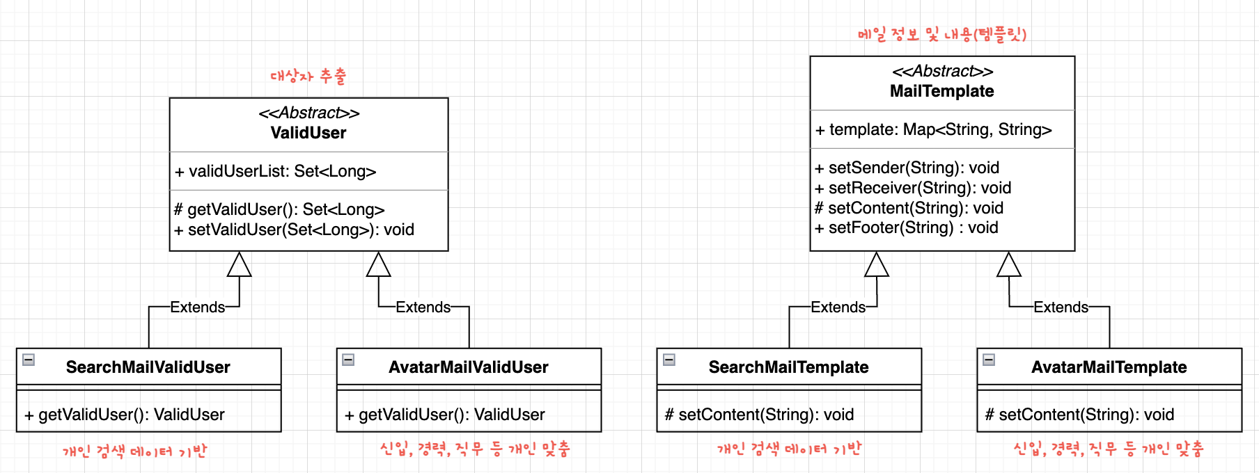 - 새로운 메일 타입 Factory를 선언하고 해당하는 대상자추출, 메일템플릿 클래스만 생성하면 확장이 가능하다.