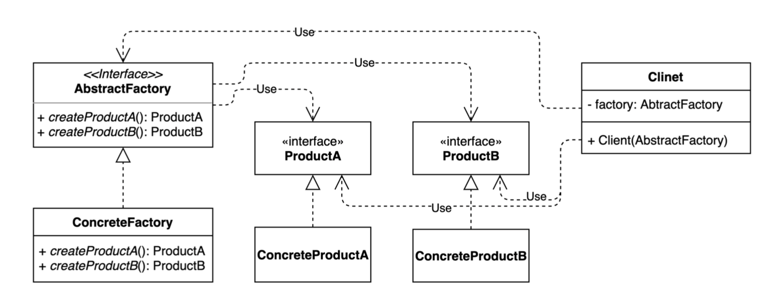 관련성이 있는 여러 종류의 객체를 생성할 때 각각 별도의 Factory 클래스를 사용하는 대신, 관련 객체들을 일관성 있게 생성하는 Factory 클래스를 정의해보자.