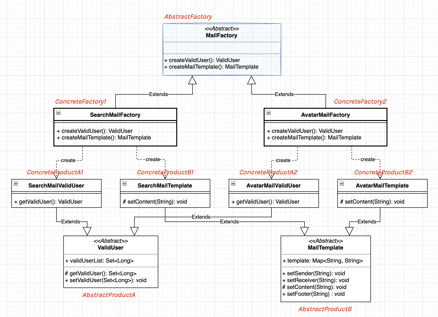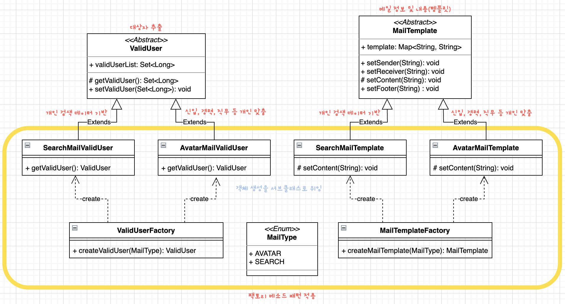 - 이전에 정의했던 ValidUserFactory, MailTemplateFactory 클래스와 같이 '기능 단위'로 Factory 클래스를 정의하지 않고, SearchMailFactory, AvatarMailFactory 클래스와 같이 '실제 발송할 메일 타입 단위'로 Factory 클래스를 정의했다.
