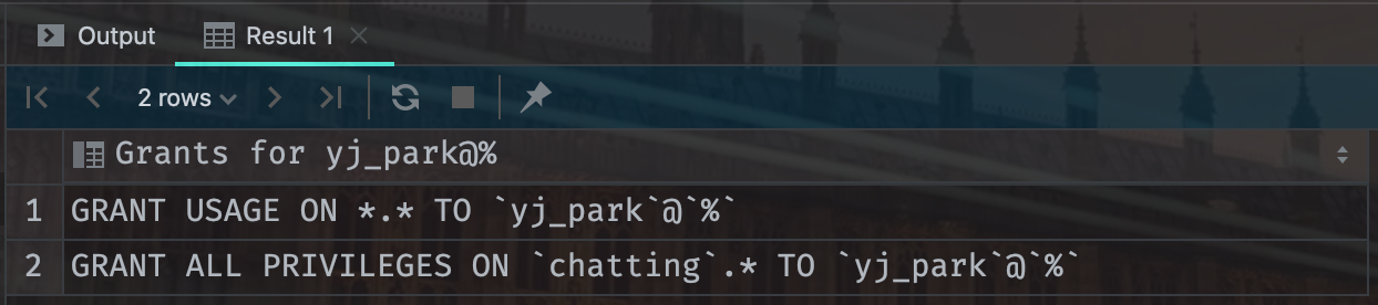 - 특정 IP 대역에서만 접속하게 설정하려면 'IP.%' 로 주면 된다.