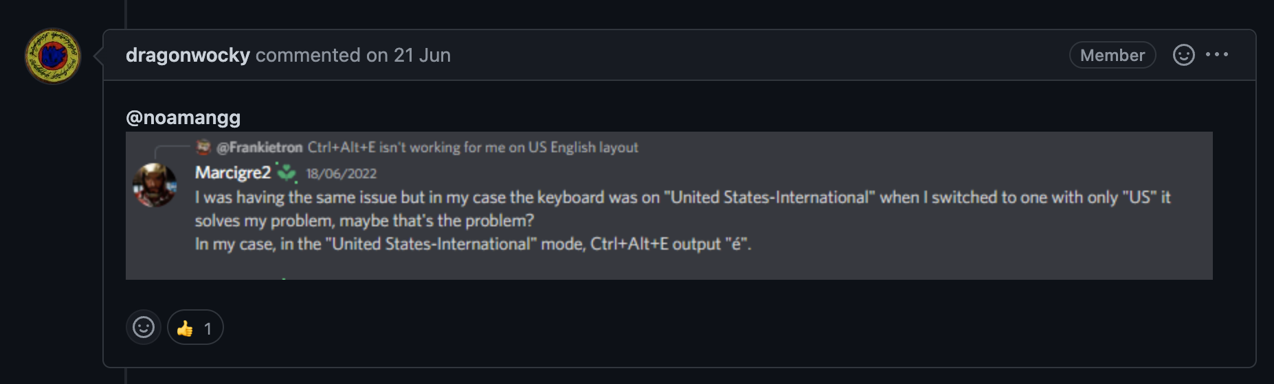 | Mac OS | Control + Option + E |