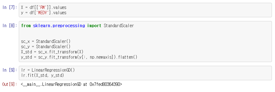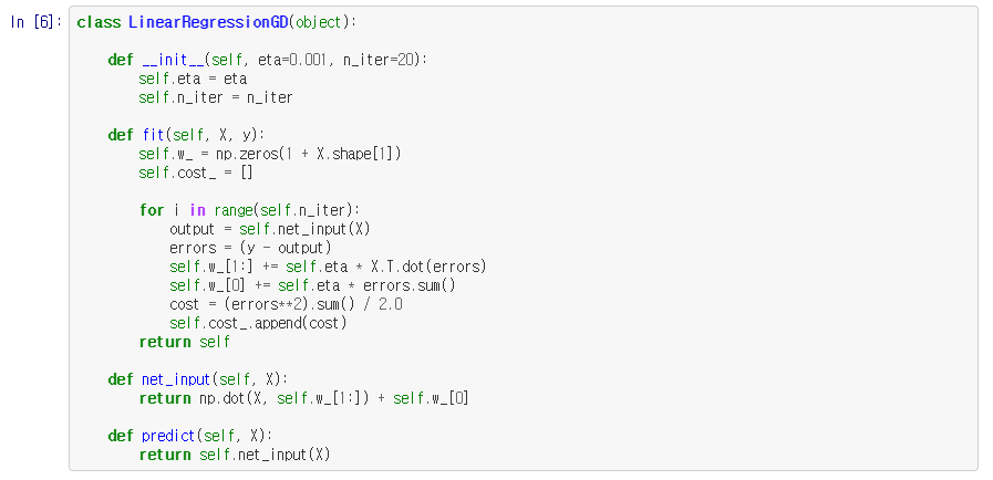 아달린의 경사 하강법 구현에서 단위 계단 함수를 제거하면 첫 번째 선형 회귀 모델을 구현해보자.