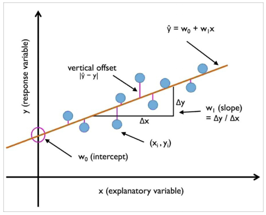 회귀 직선과 샘플 포인트 사이의 직선 거리를 오프셋(offset) 또는 예측 오차인 잔차(residual)라고 합니다.