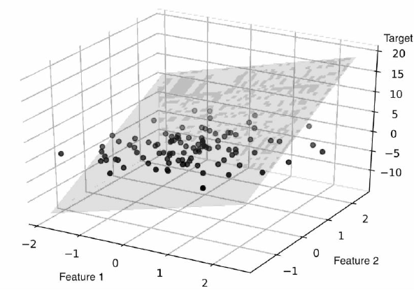 두 개의 특성을 가진 다변량 회귀 모델이 학습한 2차원 초평면으로 가시화했다.