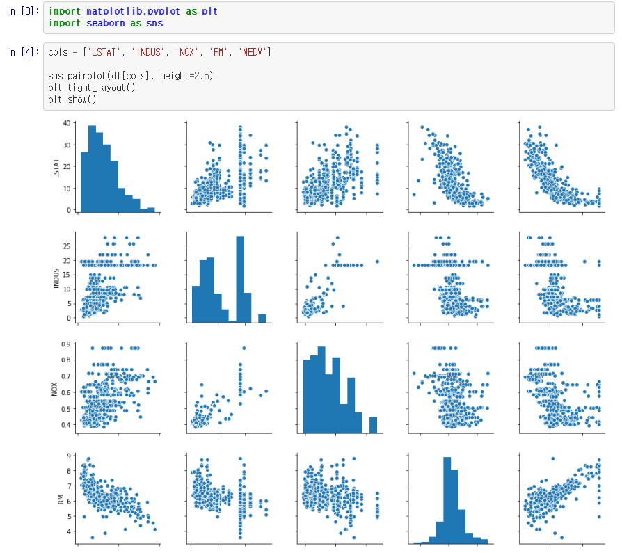데이터셋의 다른 부분을 포함시켜 산점도 행렬을 그려주면 데이터가 어떻게 분포되어 있는지, 이상치를 포함하고 있는지 빠르게 확인할 수 있다!
