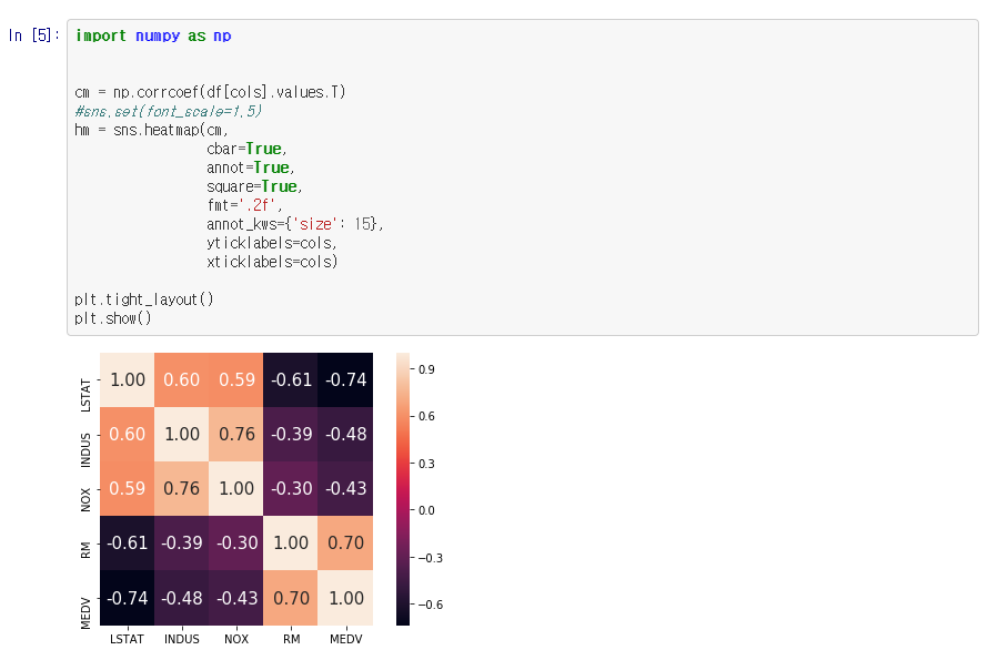 앞서 산점도 행렬로 그렸던 다섯 개의 특성에 넘파이 corrcoef 함수를 사용해보자.