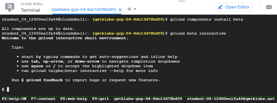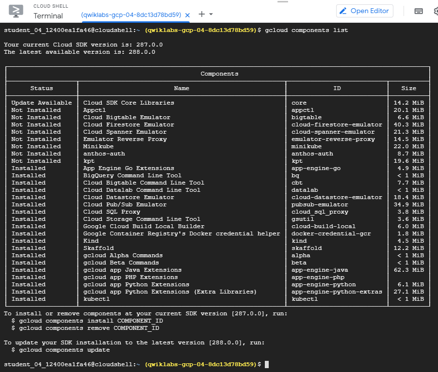 이 실습에서는 Cloud Shell을 사용하고 있으므로 gcloud를 수동으로 설치할 필요가 없다.