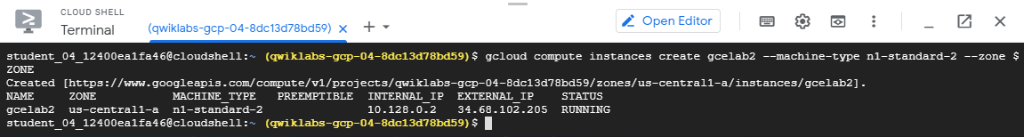 gcloud compute instances create gcelab2 --machine-type n1-standard-2 --zone $ZONE