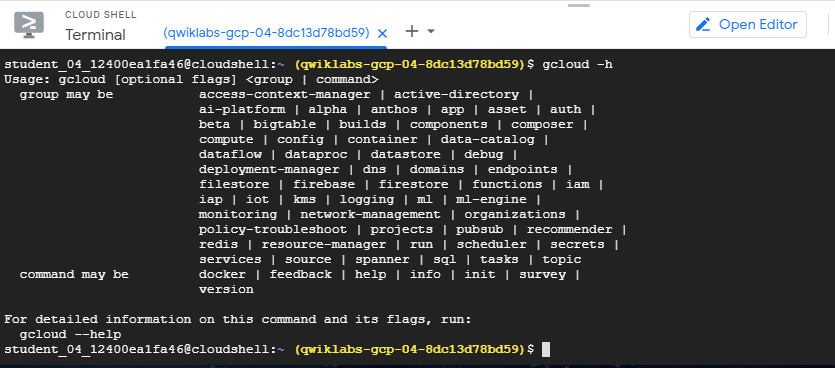 gcloud 호출 명령어의 끝에 -h 플래그를 추가하면 참고할 수 있는 간단한 사용 안내가 표시된다.