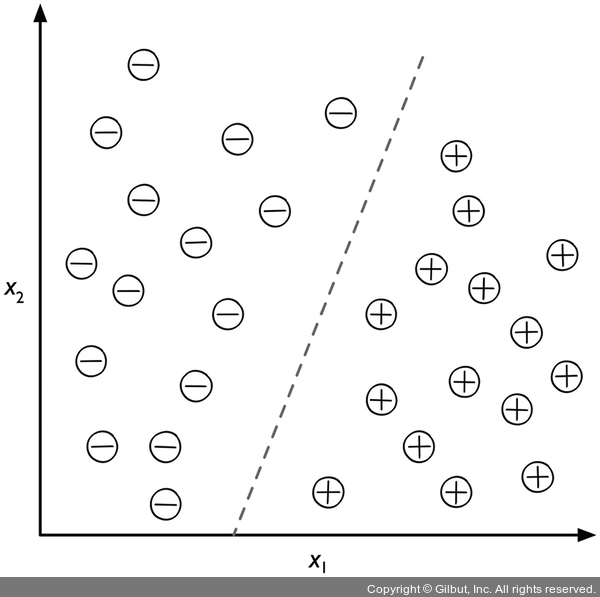 지도 학습 알고리즘을 사용하여 두 클래스를 구분할 수 있는 규칙을 학습합니다. 이 규칙은 점선으로 나타난 결정 경계(decision boundary)입니다. 새로운 데이터의 x_1, x_2 값이 주어지면 두 개의 범주 중 하나로 분류합니다.