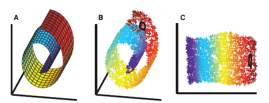 이따금 차원 축소는 데이터 시각화에도 유용합니다. 예를 들어 고차원 특성을 1차원 또는 2차원, 3차원 특성 공간으로 투영하여 3D와 2D 산점도(scatterplot)나 히스토그램(histogram)으로 시각화합니다. 아래 그림은 비선형(nonlinear) 차원 축소를 적용하여 3D 스위스롤(Swiss Roll) 모양의 데이터를 새로운 2D 특성의 부분 공간으로 압축하는 예를 보여 줍니다.