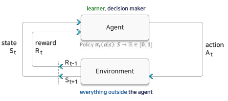 - 에이전트(Agent) : 상태를 관찰, 행동을 선택, 목표지향
