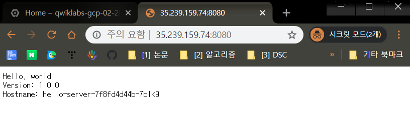 참고: 외부 IP 주소가 생성되는 데는 1분 정도 걸릴 수 있습니다 EXTERNAL-IP 열이 "대기중" 상태이면 위 명령어를 다시 실행하자.