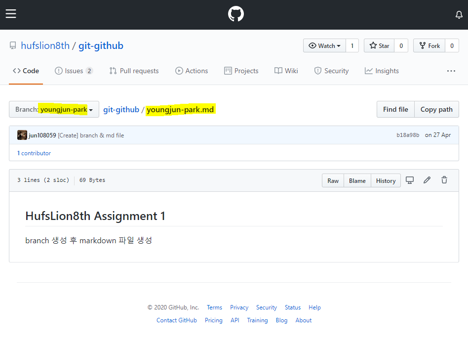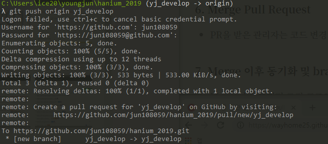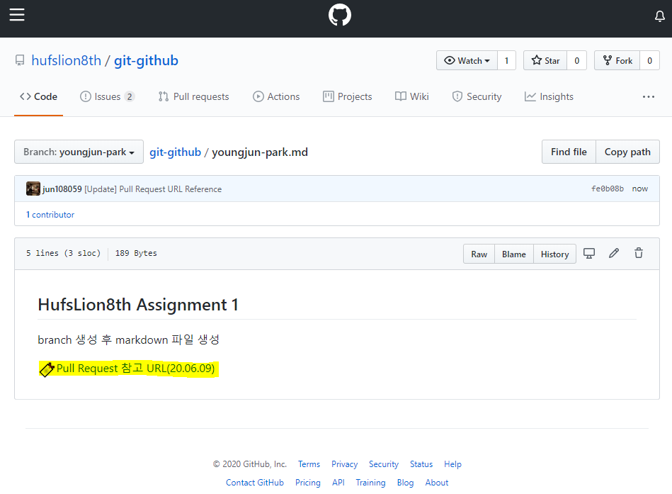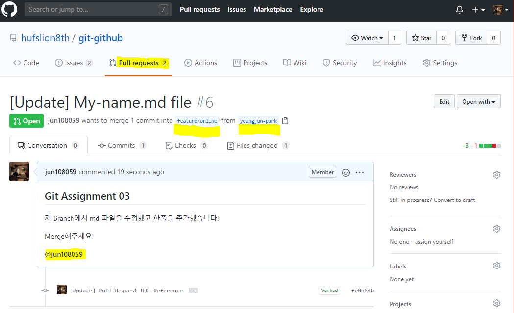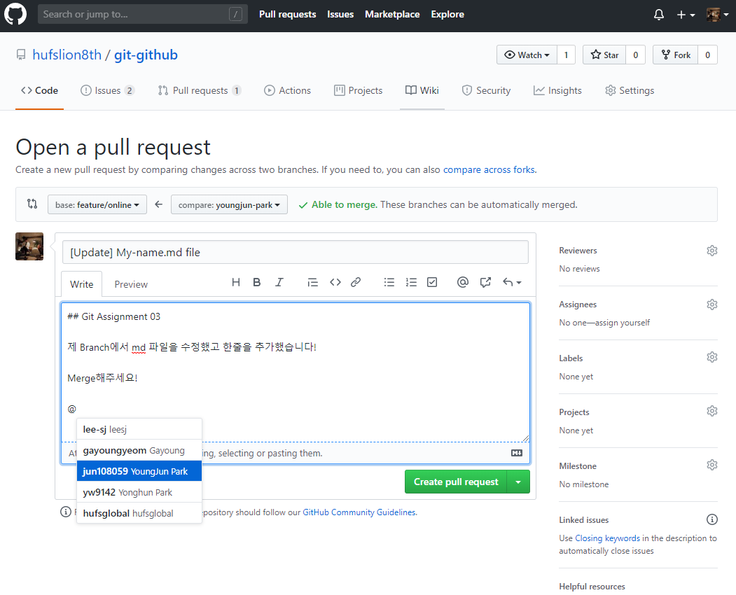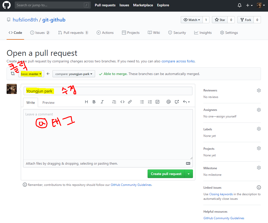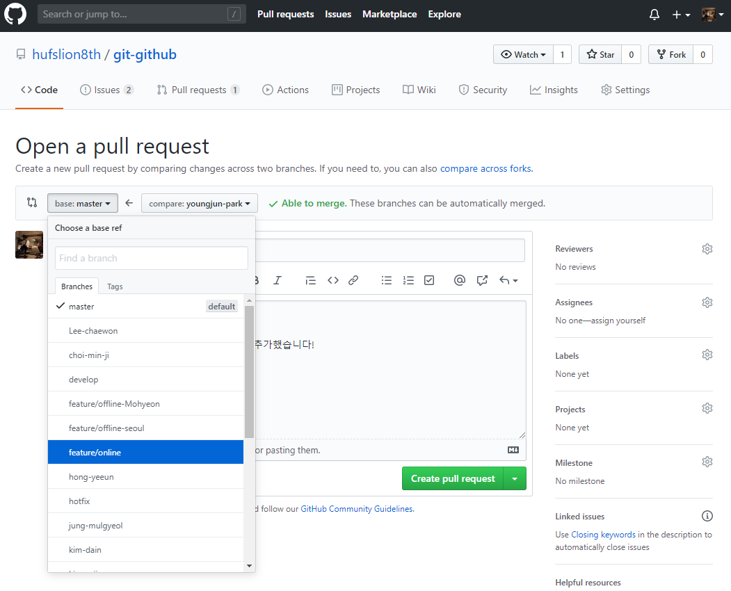 여러분 이름으로 만든 branch 명(저는 `youngjun-park' branch)으로 부터(from) 표시가 됩니다.