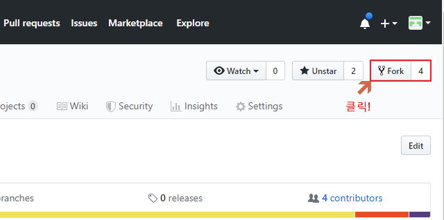 - 타겟 프로젝트의 Repository를 자신의 Repository로 Fork 한다.