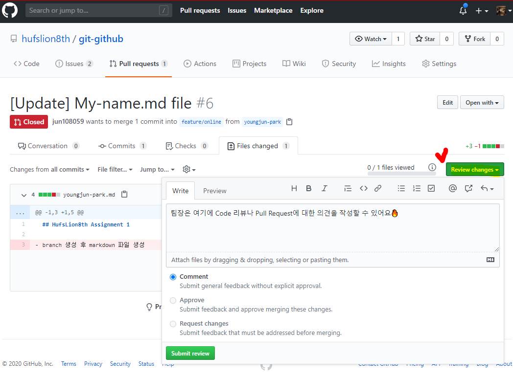 Submit review 버튼을 누르면 Comment 한 내용이 Pull request를 보낸 사람이 확인할 수 있어요.