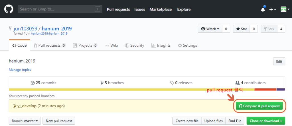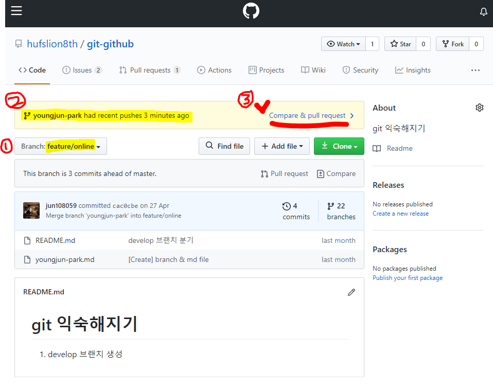(3) 오른쪽에 Compare & pull request >를 선택해보세요!