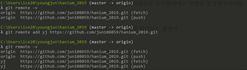 - Clone 했던 원본 프로젝트 저장소(origin)를 원격 저장소(github)로 추가