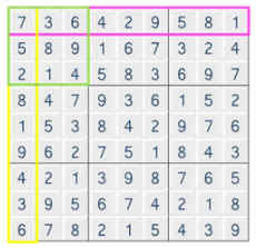 같은 줄에 1 에서 9 까지의 숫자를 한번씩만 넣고, 3 x 3 크기의 작은 격자 또한, 1 에서 9 까지의 숫자가 겹치지 않아야 한다.