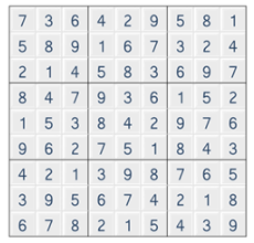같은 줄에 1 에서 9 까지의 숫자를 한번씩만 넣고, 3 x 3 크기의 작은 격자 또한, 1 에서 9 까지의 숫자가 겹치지 않아야 한다.