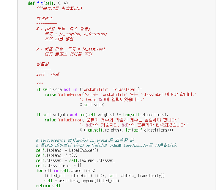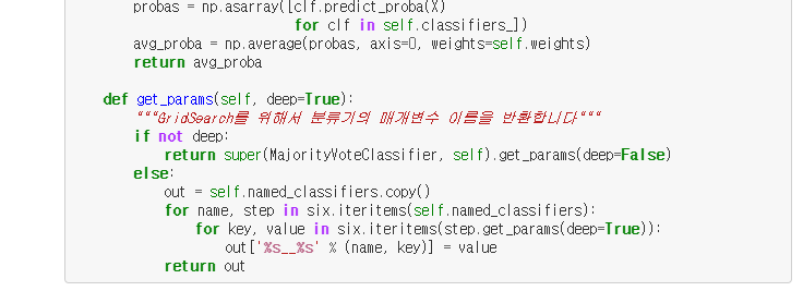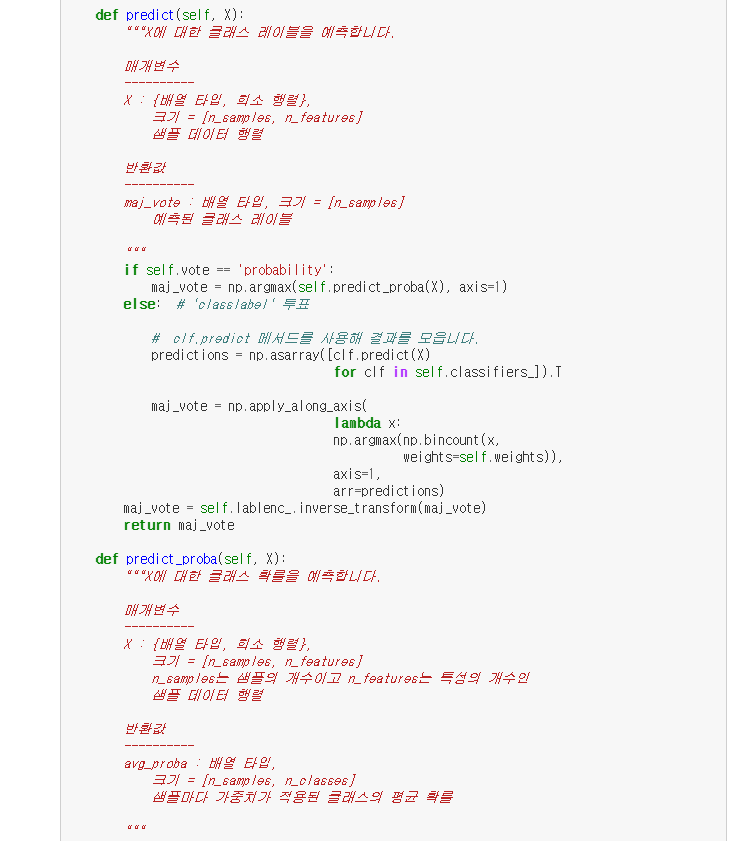 - vote = 'classlael' 객체 - 클래스 레이블에 기반을 둔 다수결 투표를 사용하여 클래스 레이블을 예측한다.