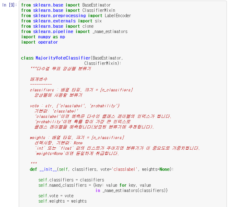 모두 결합하여 MajorityVoteClassifier 파이썬 클래스를 구현하면
