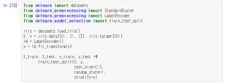 붓꽃 데이터 샘플을 훈련 데이터와 테스트 데이터 50:50으로 나눈 후