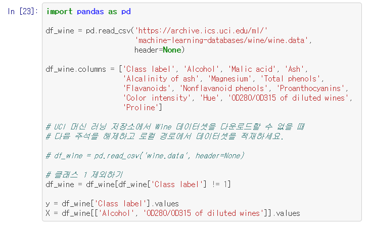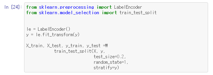 그다음 클래스 레이블을 이진 형태로 인코딩하고 80%는 훈련 세트로 20%는 테스트 세트로 분리한다.