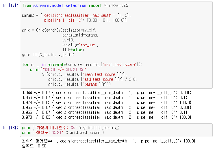 예시를 보이기 위해 그리드 서치로 로지스틱 회귀 분류기의 규제 매개변수 C와 결정 트리의 깊이를 튜닝해보자.
