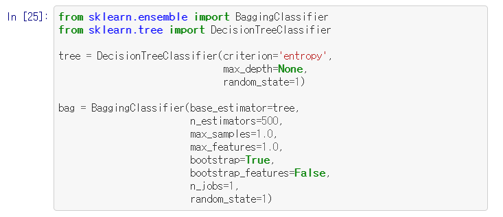 이 클래스는 ensemble 모듈에서 임포트할 수 있다. 여기서는 훈련 세트로부터 추출한 부트스트랩 샘플에서 가지치기가 없는 500개의 결정 트리를 학습하여 앙상블을 만들겠다.