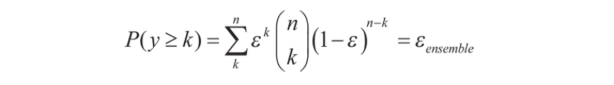 이 분류기의 앙상블이 만드는 오차 확률을 이항 분포(binomial distribution)의 확률 질량 함수(probability mass function)로 표현할 수 있다.