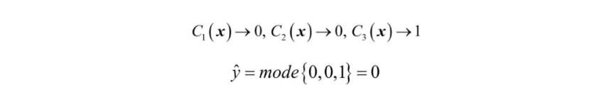 세 개의 분류기 중 두 개가 클래스 0을 예측하고 C₃ 하나가 샘플을 클래스 1로 예측하고 가중치가 동일하다면