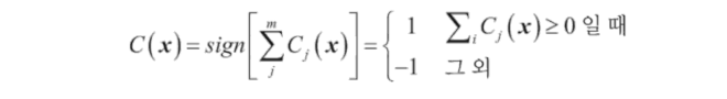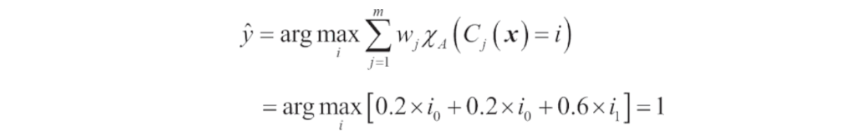 수학적으로 표현하면 가중치가 적용된 다수결 투표는 다음과 같다.