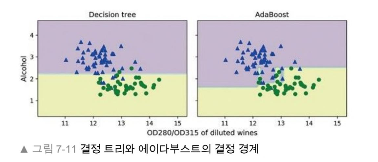 에이다부스트 모델의 결정 경계가 깊이가 1인 결정 트리의 결정 경계보다 확실히 더 복잡하다.
