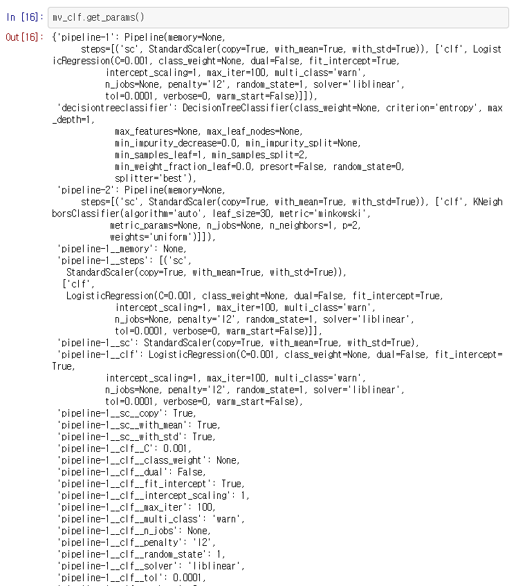 앙상블을 위해 개별 분류기의 매개변수를 튜닝하기 전에 GridSearchCV 객체 안에 있는 매개변수에 어떻게 접근할 수 있는지 get_params 메소드를 호출해서 알아보면